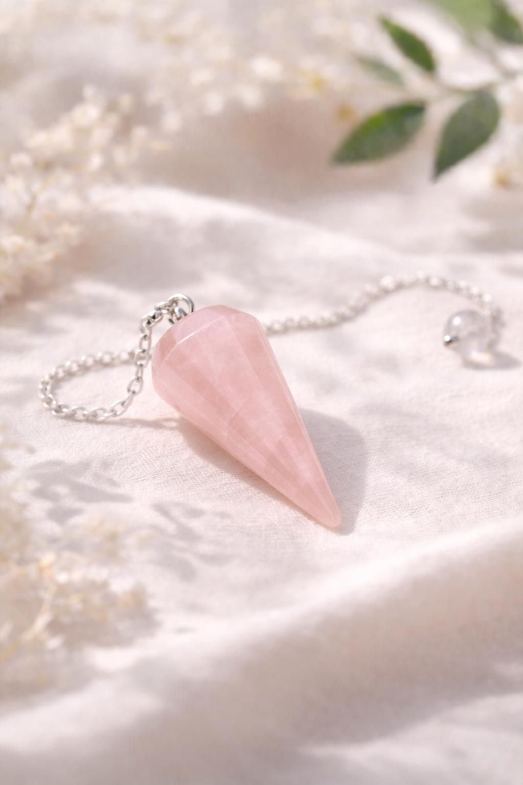 Le pendule en quartz rose est un outil de connexion douce, guidé par l’énergie de l’amour et du cœur.